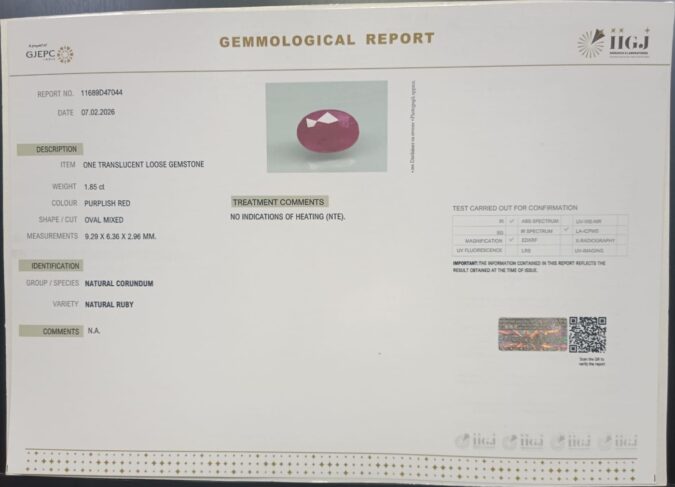 Beautiful 1.85 Cts Natural Ruby (Top-Mines) sva 2+ Ratti RUBY. Free Horoscope & Free Pundit Ji Astrological Advise / Consultation. Original Natural Lab certified gems by IGI GTL / Birth stones / Large Gem Selection of shree shubh Rashi Ratan Vedic dhan at Gem Mines. May Bhagwan Brahma, Vishnu, Shiv & Universe bless you.
