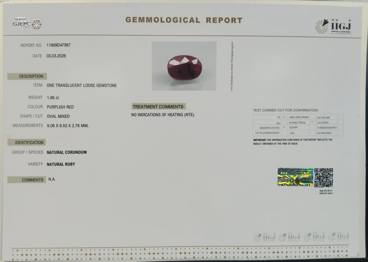 Beautiful 1.86 Cts Natural Ruby (AAA+-Mines) sva 2+ Ratti RUBY. Free Horoscope & Free Pundit Ji Astrological Advise / Consultation. Original Natural Lab certified gems by IGI GTL / Birth stones / Large Gem Selection of shree shubh Rashi Ratan Vedic dhan at Gem Mines. May Bhagwan Brahma, Vishnu, Shiv & Universe bless you.
