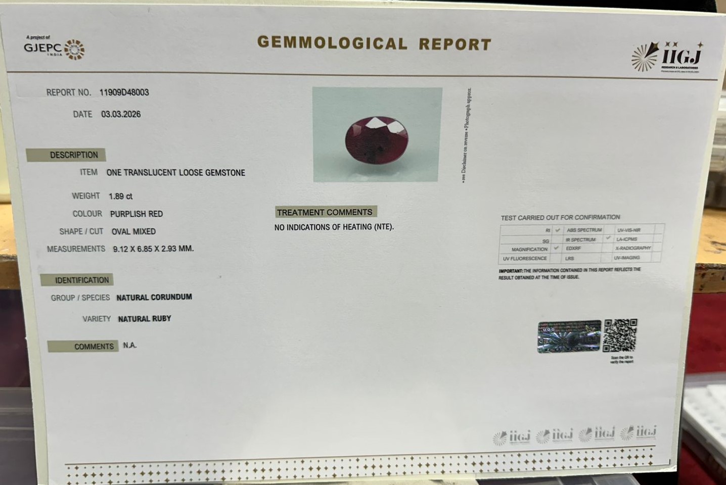 Beautiful 1.89 Cts Natural Ruby (AAA+-Mines) sva 2+ Ratti RUBY. Free Horoscope & Free Pundit Ji Astrological Advise / Consultation. Original Natural Lab certified gems by IGI GTL / Birth stones / Large Gem Selection of shree shubh Rashi Ratan Vedic dhan at Gem Mines. May Bhagwan Brahma, Vishnu, Shiv & Universe bless you.