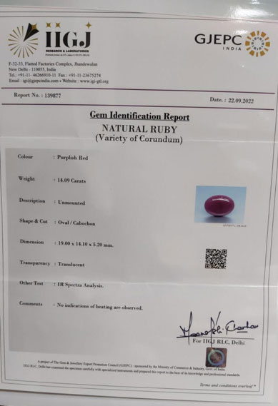Beautiful 14.09 Ct. Natural Ruby (AAA+-Mines) sva 15+ Ratti Manik. Free Horoscope & Free Pundit Ji Astrological Advise / Consultation. Original Natural Lab certified gems by IGI GTL / Birth stones / Large Gem Selection of shree shubh Rashi Ratan Vedic dhan at Gem Mines. May Bhagwan Brahma, Vishnu, Shiv & Universe bless you.