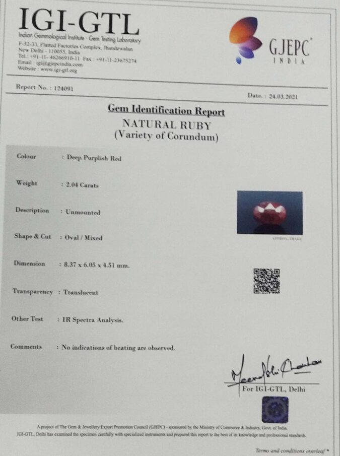 Beautiful 2.04 Ct. Ruby (Old Mines (Rare))Sava 2 Ratti Manik. Free Horoscope & Free Pundit Ji Advise / Consultation. Original Natural Lab certified gems by IGI GTL / Birth stones / Large Gem Selection of shree shubh Rashi Ratan Vedic dhan at Gem Mines. May Bhagwan Brahma, Vishnu, Shiv & Universe bless you.