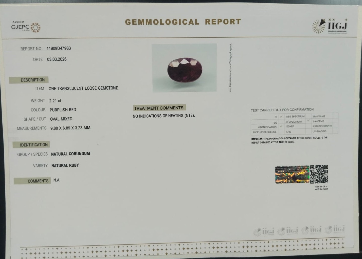 Beautiful 2.21 Cts Natural Ruby (AAA+-Mines) sva 2+ Ratti RUBY. Free Horoscope & Free Pundit Ji Astrological Advise / Consultation. Original Natural Lab certified gems by IGI GTL / Birth stones / Large Gem Selection of shree shubh Rashi Ratan Vedic dhan at Gem Mines. May Bhagwan Brahma, Vishnu, Shiv & Universe bless you.