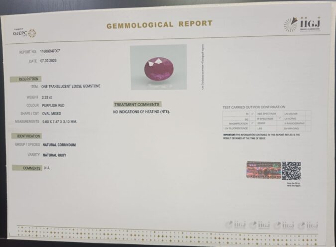 Beautiful 2.33 Cts Natural Ruby (Top-Mines) sva 2+ Ratti RUBY. Free Horoscope & Free Pundit Ji Astrological Advise / Consultation. Original Natural Lab certified gems by IGI GTL / Birth stones / Large Gem Selection of shree shubh Rashi Ratan Vedic dhan at Gem Mines. May Bhagwan Brahma, Vishnu, Shiv & Universe bless you.