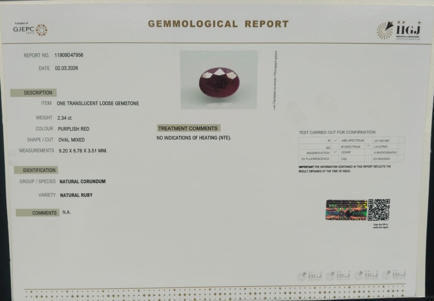Beautiful 2.34 Cts Natural Ruby (AAA-Mines) sva 2+ Ratti RUBY. Free Horoscope & Free Pundit Ji Astrological Advise / Consultation. Original Natural Lab certified gems by IGI GTL / Birth stones / Large Gem Selection of shree shubh Rashi Ratan Vedic dhan at Gem Mines. May Bhagwan Brahma, Vishnu, Shiv & Universe bless you.