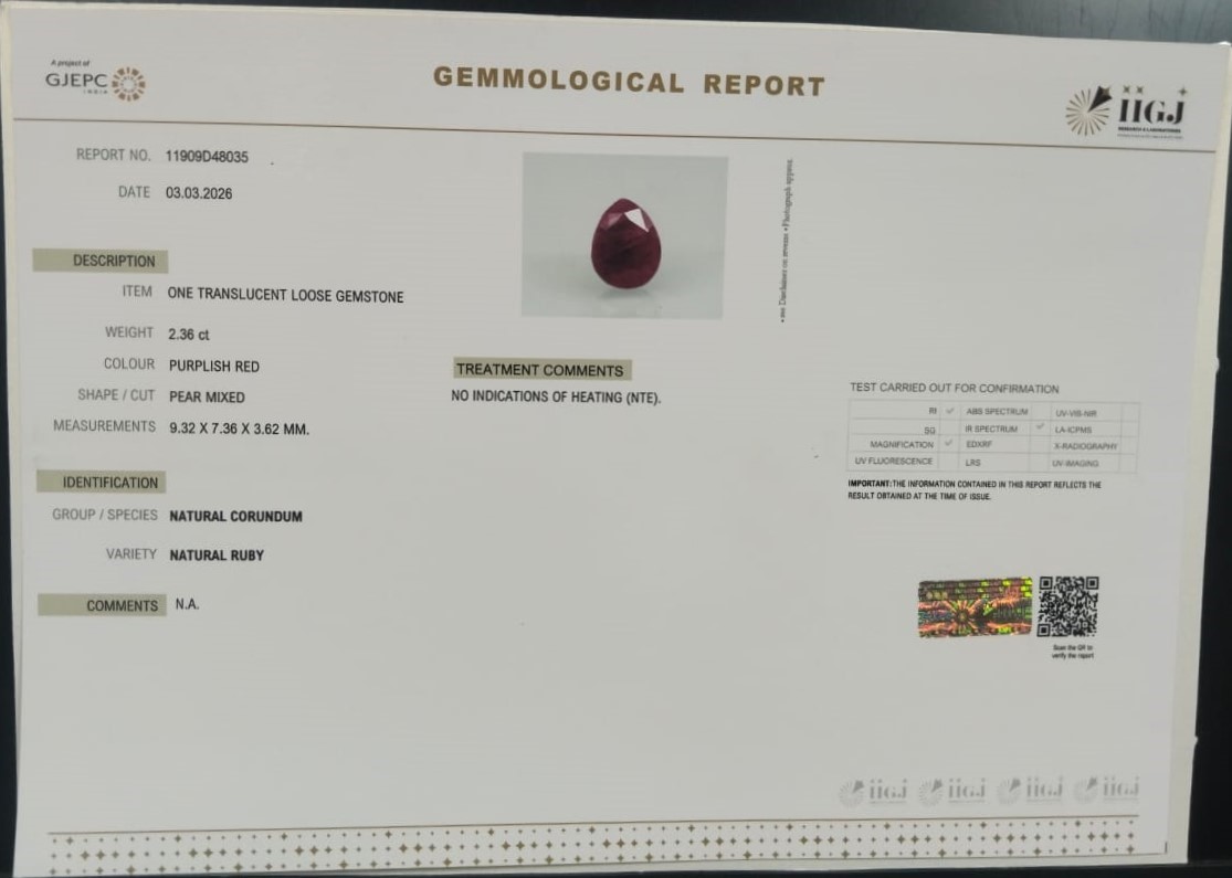 Beautiful 2.36 Cts Natural Ruby (AAA-Mines) sva 2+ Ratti RUBY. Free Horoscope & Free Pundit Ji Astrological Advise / Consultation. Original Natural Lab certified gems by IGI GTL / Birth stones / Large Gem Selection of shree shubh Rashi Ratan Vedic dhan at Gem Mines. May Bhagwan Brahma, Vishnu, Shiv & Universe bless you.