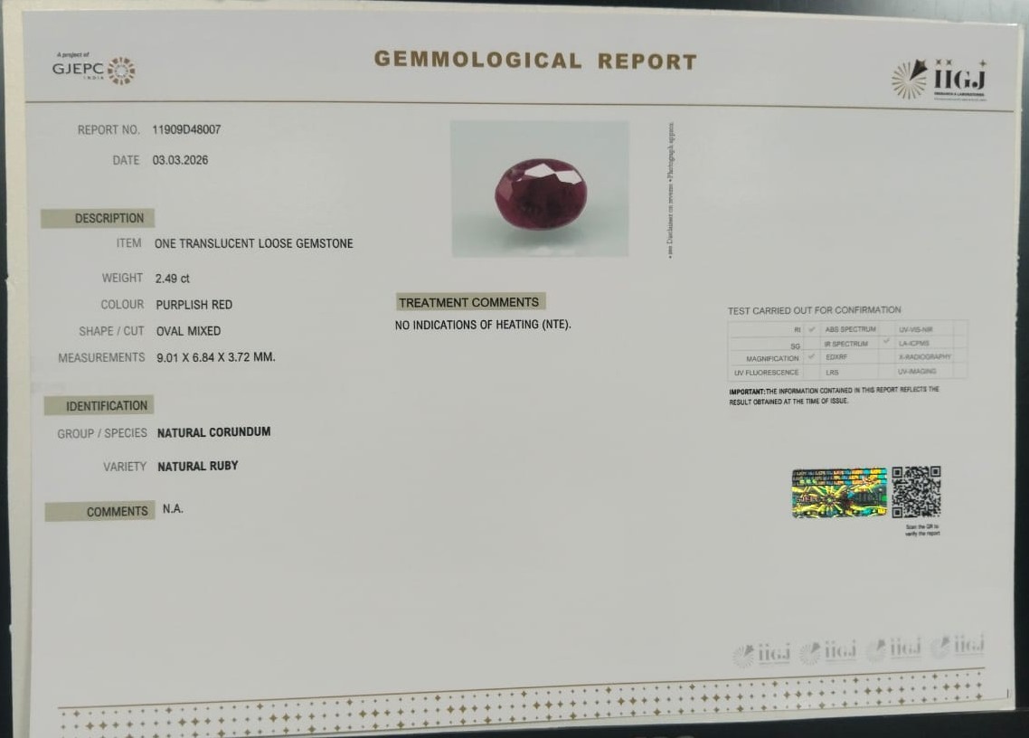 Beautiful 2.49 Cts Natural Ruby (AAA+-Mines) sva 2+ Ratti RUBY. Free Horoscope & Free Pundit Ji Astrological Advise / Consultation. Original Natural Lab certified gems by IGI GTL / Birth stones / Large Gem Selection of shree shubh Rashi Ratan Vedic dhan at Gem Mines. May Bhagwan Brahma, Vishnu, Shiv & Universe bless you.
