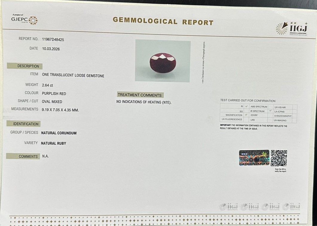 Beautiful 2.64 Cts Natural Ruby (AAA+-Mines) sva 2+ Ratti RUBY. Free Horoscope & Free Pundit Ji Astrological Advise / Consultation. Original Natural Lab certified gems by IGI GTL / Birth stones / Large Gem Selection of shree shubh Rashi Ratan Vedic dhan at Gem Mines. May Bhagwan Brahma, Vishnu, Shiv & Universe bless you.