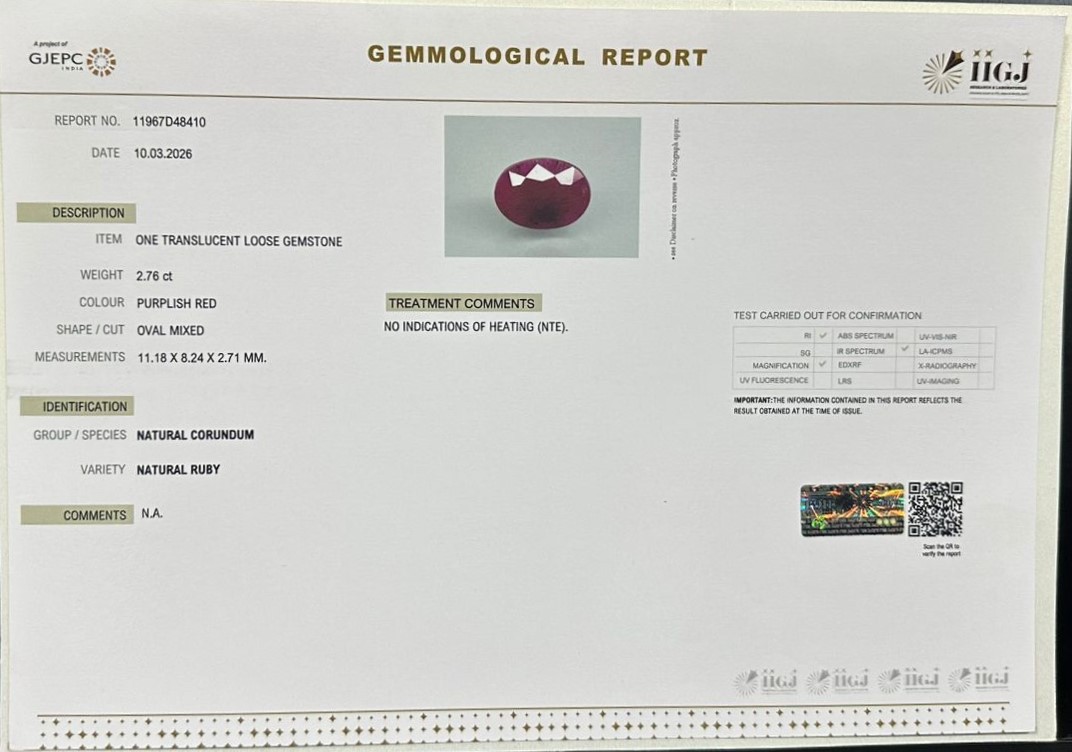 Beautiful 2.76 Cts Natural Ruby (AAA+-Mines) sva 3+ Ratti RUBY. Free Horoscope & Free Pundit Ji Astrological Advise / Consultation. Original Natural Lab certified gems by IGI GTL / Birth stones / Large Gem Selection of shree shubh Rashi Ratan Vedic dhan at Gem Mines. May Bhagwan Brahma, Vishnu, Shiv & Universe bless you.