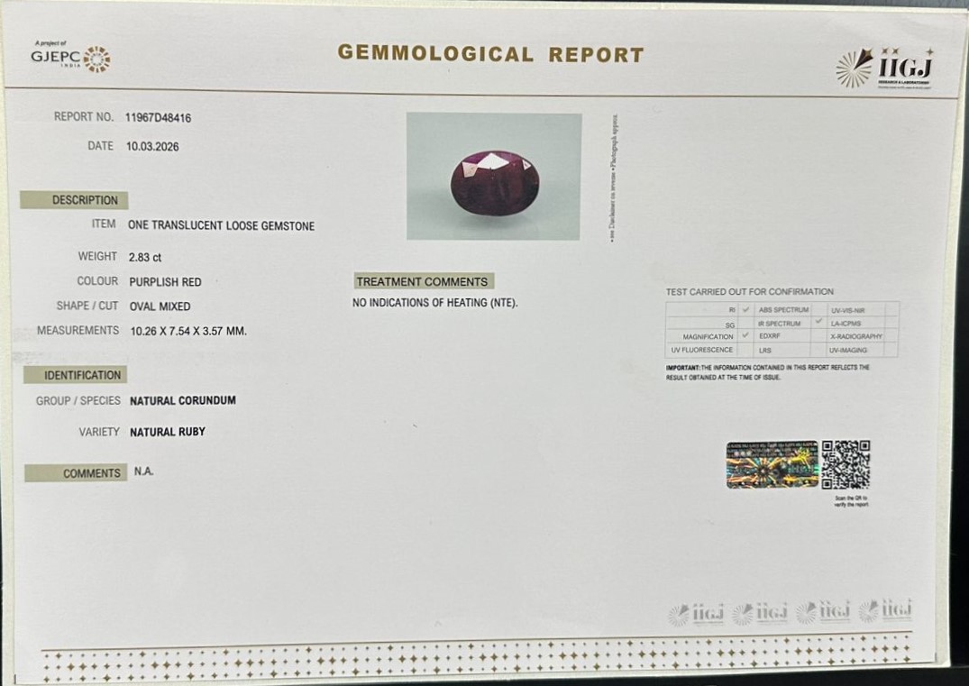 Beautiful 2.83 Cts Natural Ruby (AAA+-Mines) sva 3+ Ratti RUBY. Free Horoscope & Free Pundit Ji Astrological Advise / Consultation. Original Natural Lab certified gems by IGI GTL / Birth stones / Large Gem Selection of shree shubh Rashi Ratan Vedic dhan at Gem Mines. May Bhagwan Brahma, Vishnu, Shiv & Universe bless you.