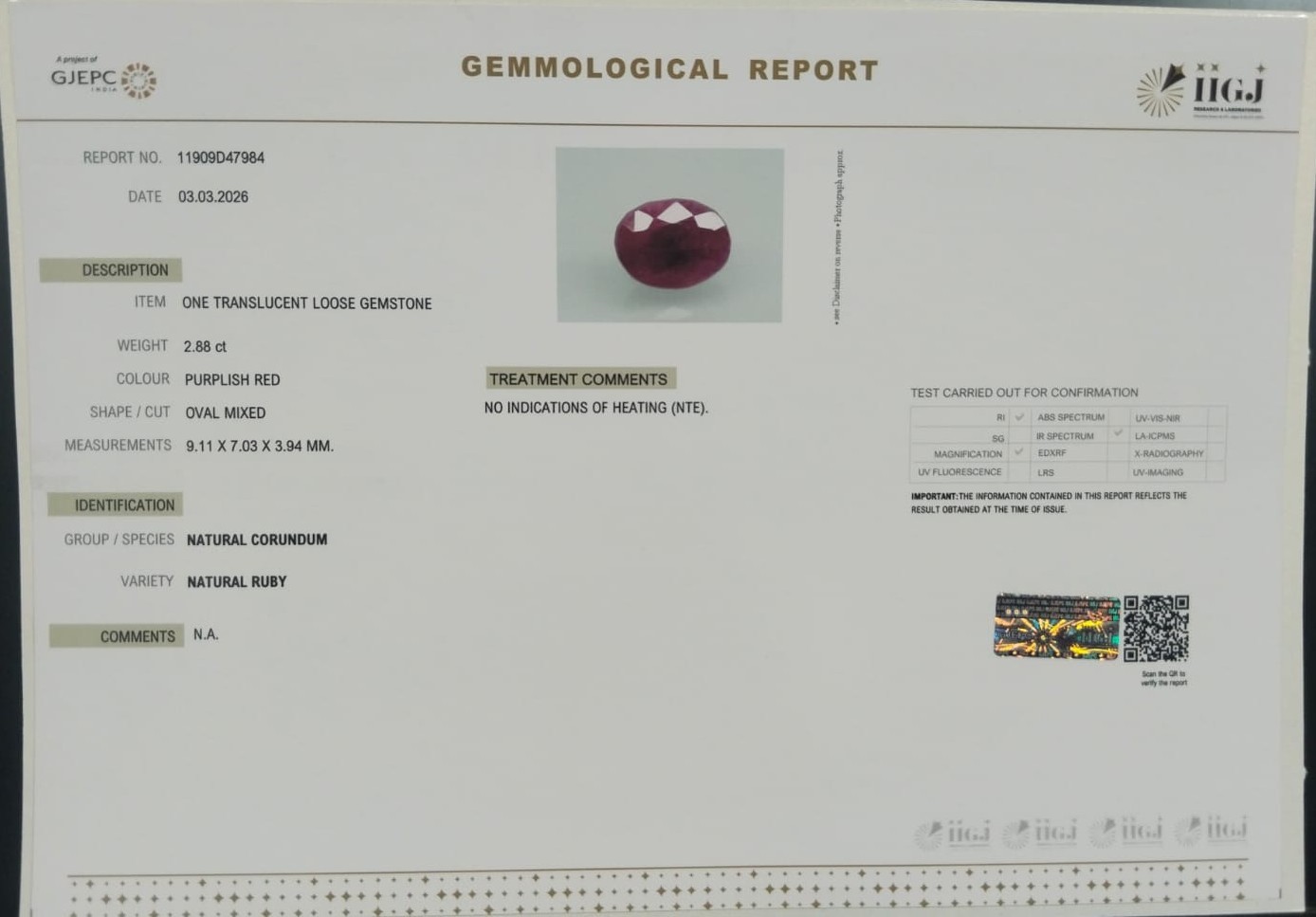 Beautiful 2.88 Cts Natural Ruby (AAA+-Mines) sva 3+ Ratti RUBY. Free Horoscope & Free Pundit Ji Astrological Advise / Consultation. Original Natural Lab certified gems by IGI GTL / Birth stones / Large Gem Selection of shree shubh Rashi Ratan Vedic dhan at Gem Mines. May Bhagwan Brahma, Vishnu, Shiv & Universe bless you.