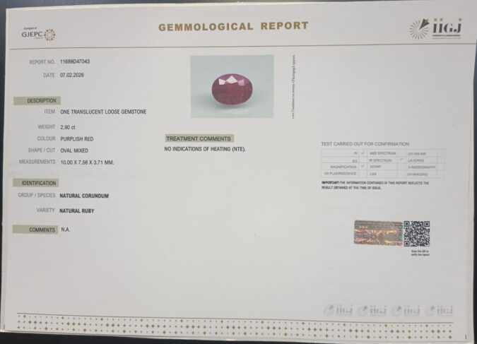 Beautiful 2.9 Cts Natural Ruby (Top-Mines) sva 3+ Ratti RUBY. Free Horoscope & Free Pundit Ji Astrological Advise / Consultation. Original Natural Lab certified gems by IGI GTL / Birth stones / Large Gem Selection of shree shubh Rashi Ratan Vedic dhan at Gem Mines. May Bhagwan Brahma, Vishnu, Shiv & Universe bless you.