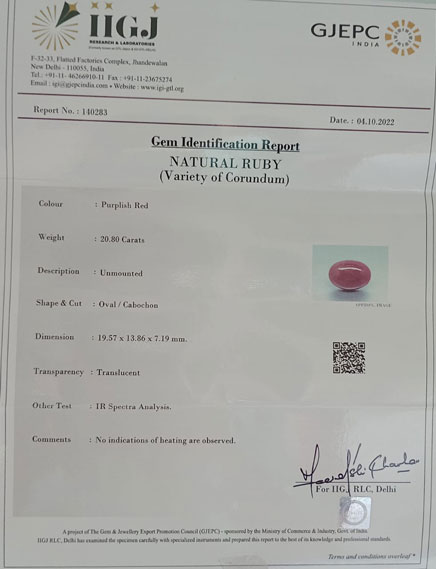 Beautiful 20.8 Ct. Natural Ruby (AAA+-Mines) sva 23+ Ratti Manik. Free Horoscope & Free Pundit Ji Astrological Advise / Consultation. Original Natural Lab certified gems by IGI GTL / Birth stones / Large Gem Selection of shree shubh Rashi Ratan Vedic dhan at Gem Mines. May Bhagwan Brahma, Vishnu, Shiv & Universe bless you.