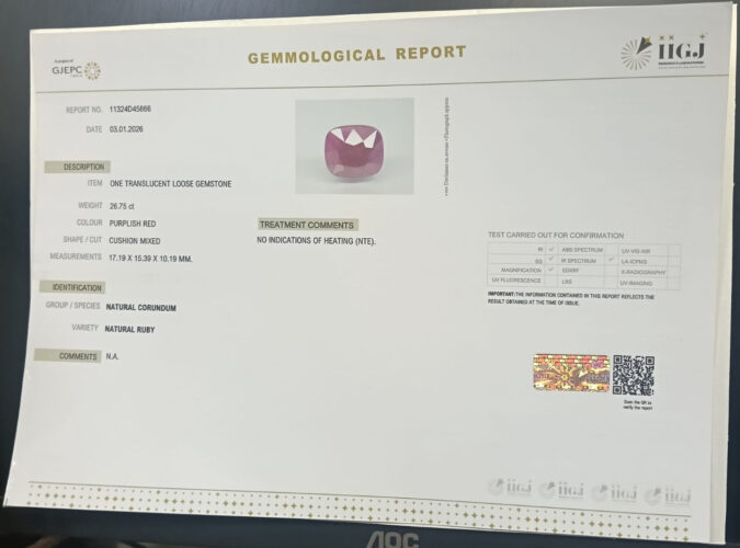 Beautiful 26.75 Cts Natural Ruby (Top++-Mines) sva 29+ Ratti RUBY. Free Horoscope & Free Pundit Ji Astrological Advise / Consultation. Original Natural Lab certified gems by IGI GTL / Birth stones / Large Gem Selection of shree shubh Rashi Ratan Vedic dhan at Gem Mines. May Bhagwan Brahma, Vishnu, Shiv & Universe bless you.