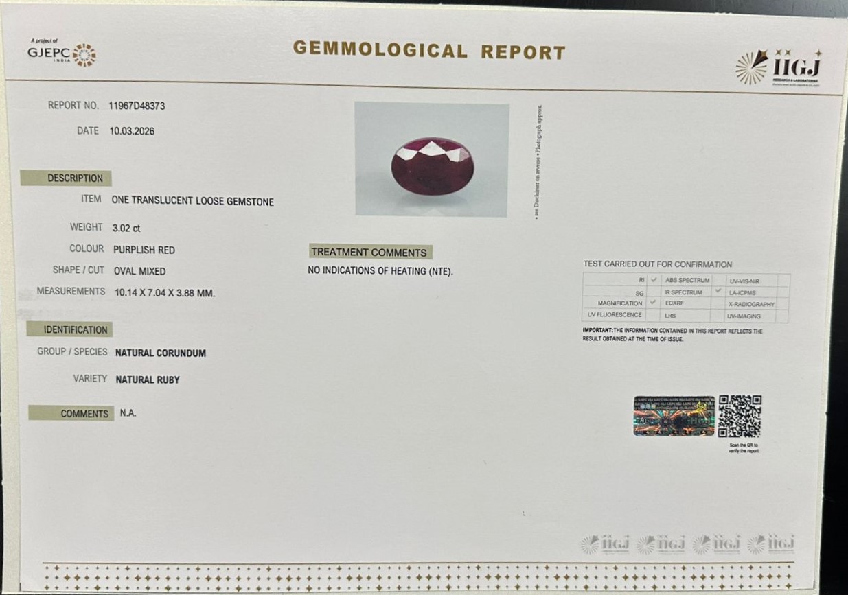 Beautiful 3.02 Cts Natural Ruby (AAA+-Mines) sva 3+ Ratti RUBY. Free Horoscope & Free Pundit Ji Astrological Advise / Consultation. Original Natural Lab certified gems by IGI GTL / Birth stones / Large Gem Selection of shree shubh Rashi Ratan Vedic dhan at Gem Mines. May Bhagwan Brahma, Vishnu, Shiv & Universe bless you.