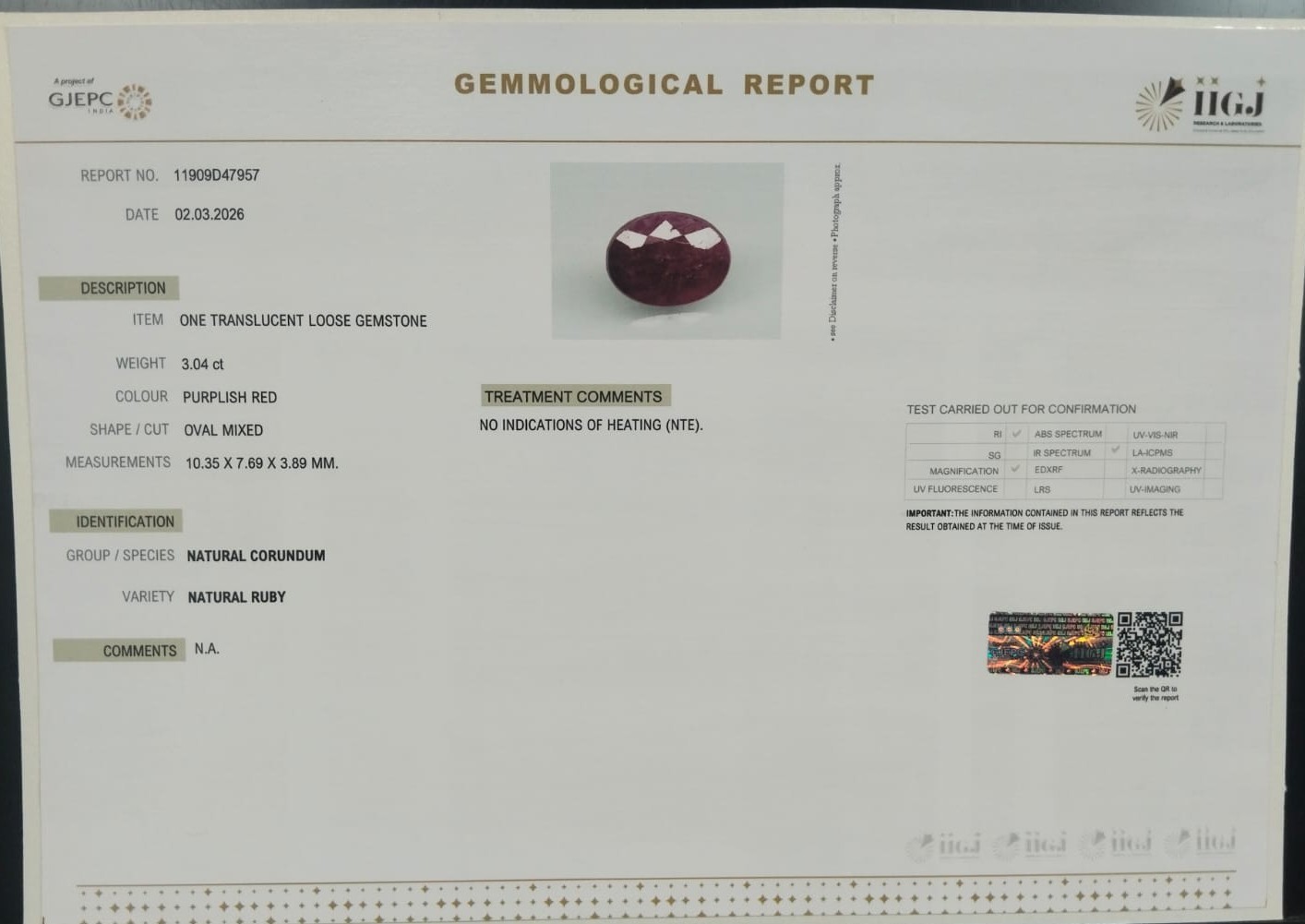 Beautiful 3.04 Cts Natural Ruby (AAA+-Mines) sva 3+ Ratti RUBY. Free Horoscope & Free Pundit Ji Astrological Advise / Consultation. Original Natural Lab certified gems by IGI GTL / Birth stones / Large Gem Selection of shree shubh Rashi Ratan Vedic dhan at Gem Mines. May Bhagwan Brahma, Vishnu, Shiv & Universe bless you.