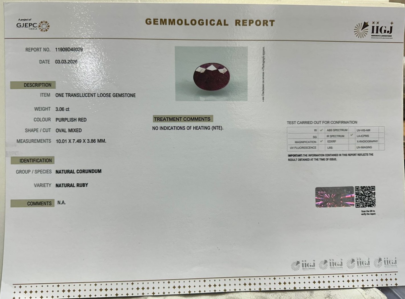 Beautiful 3.06 Cts Natural Ruby (AAA+-Mines) sva 3+ Ratti RUBY. Free Horoscope & Free Pundit Ji Astrological Advise / Consultation. Original Natural Lab certified gems by IGI GTL / Birth stones / Large Gem Selection of shree shubh Rashi Ratan Vedic dhan at Gem Mines. May Bhagwan Brahma, Vishnu, Shiv & Universe bless you.