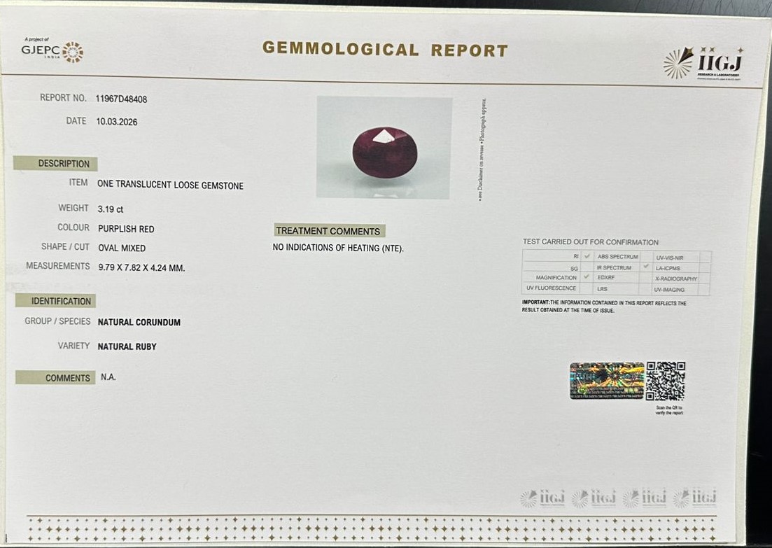 Beautiful 3.19 Cts Natural Ruby (AAA+-Mines) sva 3+ Ratti RUBY. Free Horoscope & Free Pundit Ji Astrological Advise / Consultation. Original Natural Lab certified gems by IGI GTL / Birth stones / Large Gem Selection of shree shubh Rashi Ratan Vedic dhan at Gem Mines. May Bhagwan Brahma, Vishnu, Shiv & Universe bless you.