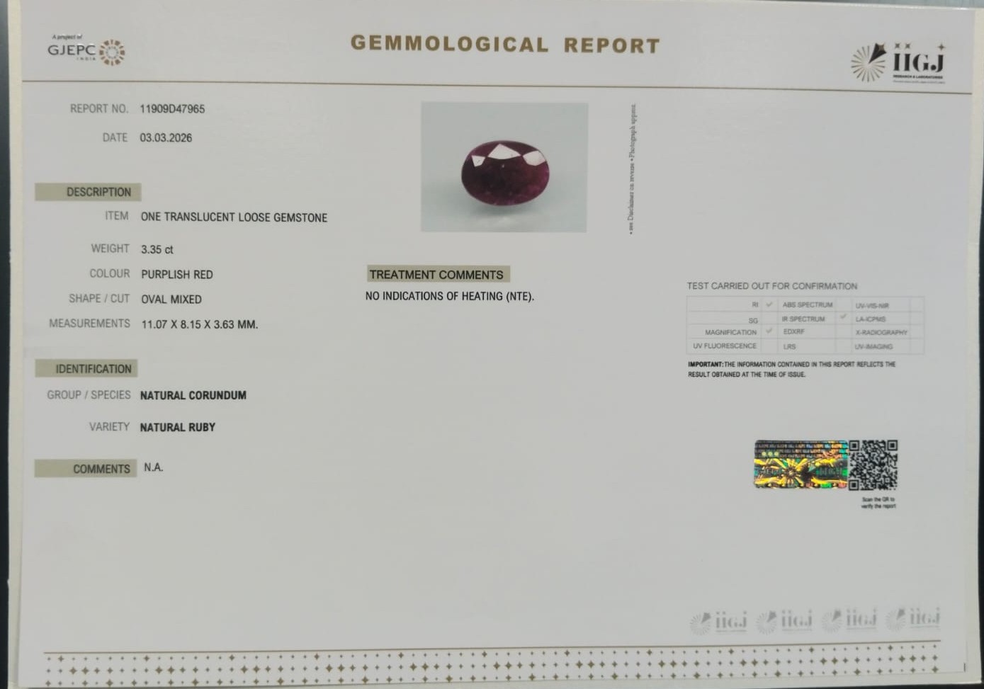 Beautiful 3.35 Cts Natural Ruby (AAA-Mines) sva 3+ Ratti RUBY. Free Horoscope & Free Pundit Ji Astrological Advise / Consultation. Original Natural Lab certified gems by IGI GTL / Birth stones / Large Gem Selection of shree shubh Rashi Ratan Vedic dhan at Gem Mines. May Bhagwan Brahma, Vishnu, Shiv & Universe bless you.