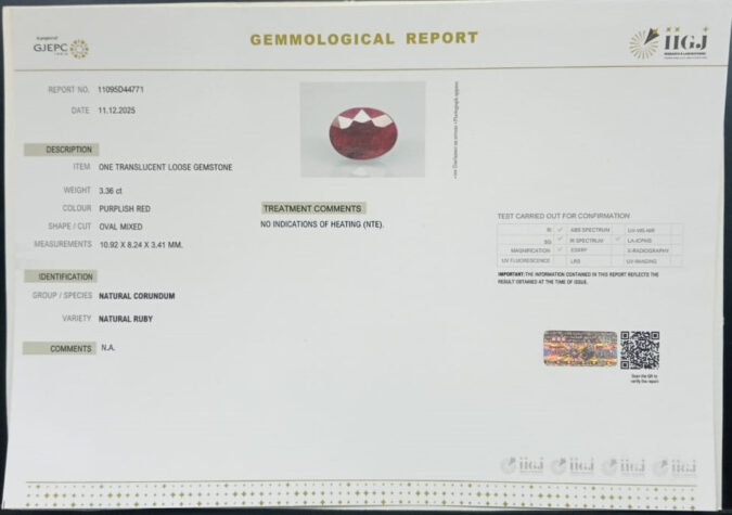 Beautiful 3.36 Cts Natural Ruby (Top+-Mines) sva 3+ Ratti RUBY. Free Horoscope & Free Pundit Ji Astrological Advise / Consultation. Original Natural Lab certified gems by IGI GTL / Birth stones / Large Gem Selection of shree shubh Rashi Ratan Vedic dhan at Gem Mines. May Bhagwan Brahma, Vishnu, Shiv & Universe bless you.