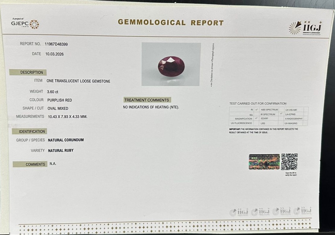 Beautiful 3.6 Cts Natural Ruby (AAA+-Mines) sva 4+ Ratti RUBY. Free Horoscope & Free Pundit Ji Astrological Advise / Consultation. Original Natural Lab certified gems by IGI GTL / Birth stones / Large Gem Selection of shree shubh Rashi Ratan Vedic dhan at Gem Mines. May Bhagwan Brahma, Vishnu, Shiv & Universe bless you.