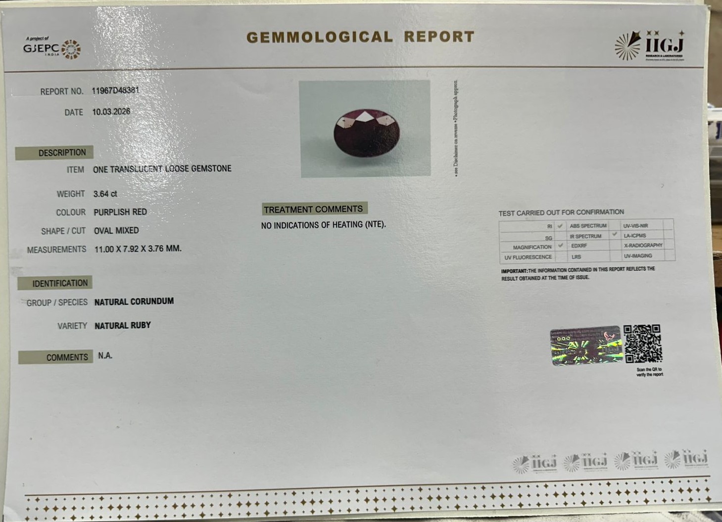 Beautiful 3.64 Cts Natural Ruby (AAA+-Mines) sva 4+ Ratti RUBY. Free Horoscope & Free Pundit Ji Astrological Advise / Consultation. Original Natural Lab certified gems by IGI GTL / Birth stones / Large Gem Selection of shree shubh Rashi Ratan Vedic dhan at Gem Mines. May Bhagwan Brahma, Vishnu, Shiv & Universe bless you.