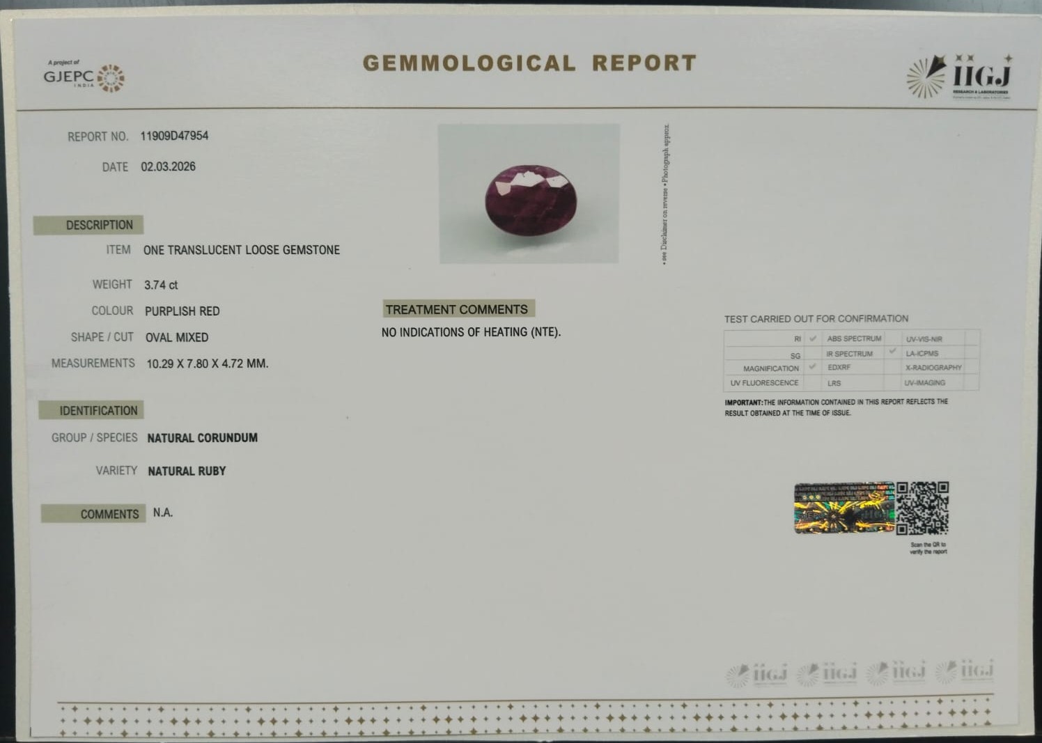 Beautiful 3.74 Cts Natural Ruby (AAA+-Mines) sva 4+ Ratti RUBY. Free Horoscope & Free Pundit Ji Astrological Advise / Consultation. Original Natural Lab certified gems by IGI GTL / Birth stones / Large Gem Selection of shree shubh Rashi Ratan Vedic dhan at Gem Mines. May Bhagwan Brahma, Vishnu, Shiv & Universe bless you.