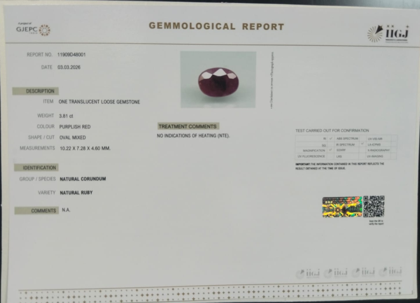 Beautiful 3.81 Cts Natural Ruby (AAA+-Mines) sva 4+ Ratti RUBY. Free Horoscope & Free Pundit Ji Astrological Advise / Consultation. Original Natural Lab certified gems by IGI GTL / Birth stones / Large Gem Selection of shree shubh Rashi Ratan Vedic dhan at Gem Mines. May Bhagwan Brahma, Vishnu, Shiv & Universe bless you.