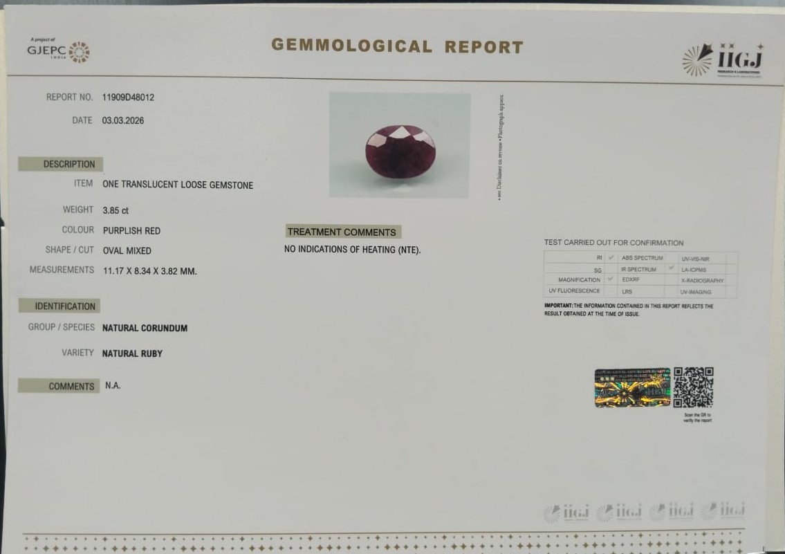 Beautiful 3.85 Cts Natural Ruby (AAA+-Mines) sva 4+ Ratti RUBY. Free Horoscope & Free Pundit Ji Astrological Advise / Consultation. Original Natural Lab certified gems by IGI GTL / Birth stones / Large Gem Selection of shree shubh Rashi Ratan Vedic dhan at Gem Mines. May Bhagwan Brahma, Vishnu, Shiv & Universe bless you.