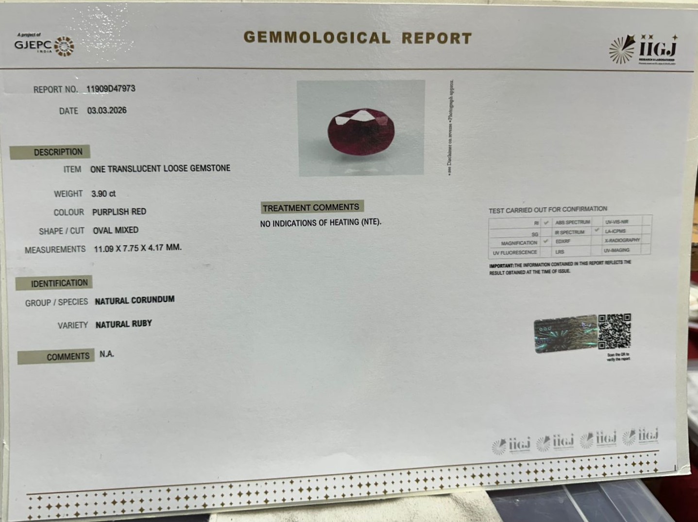 Beautiful 3.9 Cts Natural Ruby (AAA+-Mines) sva 4+ Ratti RUBY. Free Horoscope & Free Pundit Ji Astrological Advise / Consultation. Original Natural Lab certified gems by IGI GTL / Birth stones / Large Gem Selection of shree shubh Rashi Ratan Vedic dhan at Gem Mines. May Bhagwan Brahma, Vishnu, Shiv & Universe bless you.