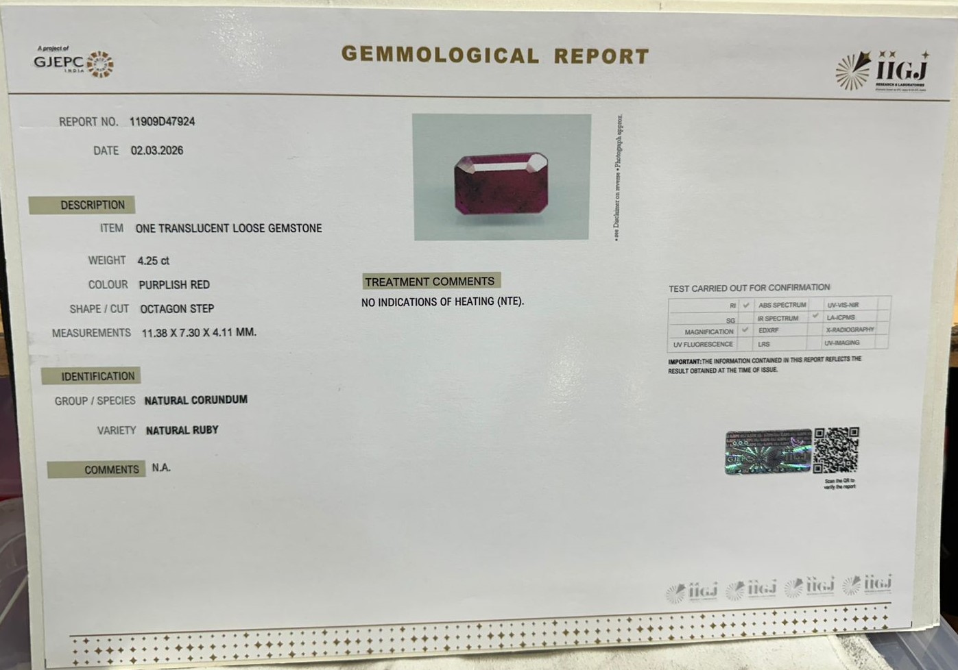 Beautiful 4.25 Cts Natural Ruby (AAA-Mines) sva 4+ Ratti RUBY. Free Horoscope & Free Pundit Ji Astrological Advise / Consultation. Original Natural Lab certified gems by IGI GTL / Birth stones / Large Gem Selection of shree shubh Rashi Ratan Vedic dhan at Gem Mines. May Bhagwan Brahma, Vishnu, Shiv & Universe bless you.