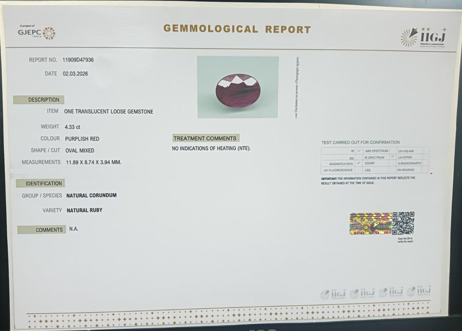 Beautiful 4.33 Cts Natural Ruby (AAA-Mines) sva 4+ Ratti RUBY. Free Horoscope & Free Pundit Ji Astrological Advise / Consultation. Original Natural Lab certified gems by IGI GTL / Birth stones / Large Gem Selection of shree shubh Rashi Ratan Vedic dhan at Gem Mines. May Bhagwan Brahma, Vishnu, Shiv & Universe bless you.
