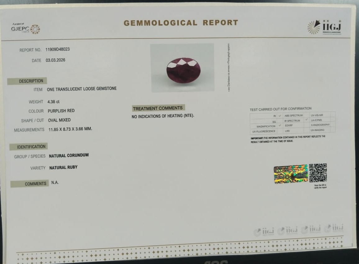 Beautiful 4.38 Cts Natural Ruby (AAA-Mines) sva 4+ Ratti RUBY. Free Horoscope & Free Pundit Ji Astrological Advise / Consultation. Original Natural Lab certified gems by IGI GTL / Birth stones / Large Gem Selection of shree shubh Rashi Ratan Vedic dhan at Gem Mines. May Bhagwan Brahma, Vishnu, Shiv & Universe bless you.