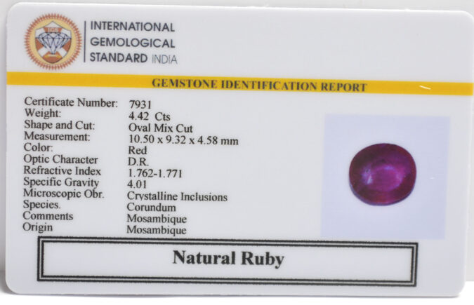 Beautiful 4.42 Cts Natural Ruby (AAA-Mines) sva 4+ Ratti RUBY. Free Horoscope & Free Pundit Ji Astrological Advise / Consultation. Original Natural Lab certified gems by IGI GTL / Birth stones / Large Gem Selection of shree shubh Rashi Ratan Vedic dhan at Gem Mines. May Bhagwan Brahma, Vishnu, Shiv & Universe bless you.