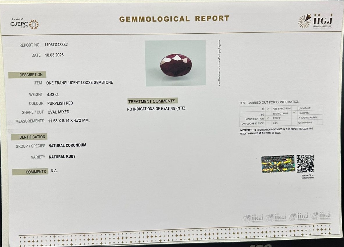 Beautiful 4.43 Cts Natural Ruby (AAA+-Mines) sva 4+ Ratti RUBY. Free Horoscope & Free Pundit Ji Astrological Advise / Consultation. Original Natural Lab certified gems by IGI GTL / Birth stones / Large Gem Selection of shree shubh Rashi Ratan Vedic dhan at Gem Mines. May Bhagwan Brahma, Vishnu, Shiv & Universe bless you.
