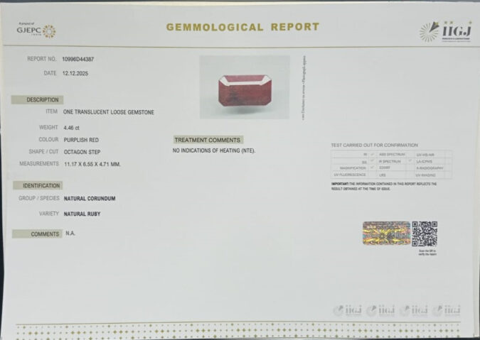 Beautiful 4.46 Cts Natural Ruby (Top-Mines) sva 4+ Ratti RUBY. Free Horoscope & Free Pundit Ji Astrological Advise / Consultation. Original Natural Lab certified gems by IGI GTL / Birth stones / Large Gem Selection of shree shubh Rashi Ratan Vedic dhan at Gem Mines. May Bhagwan Brahma, Vishnu, Shiv & Universe bless you.