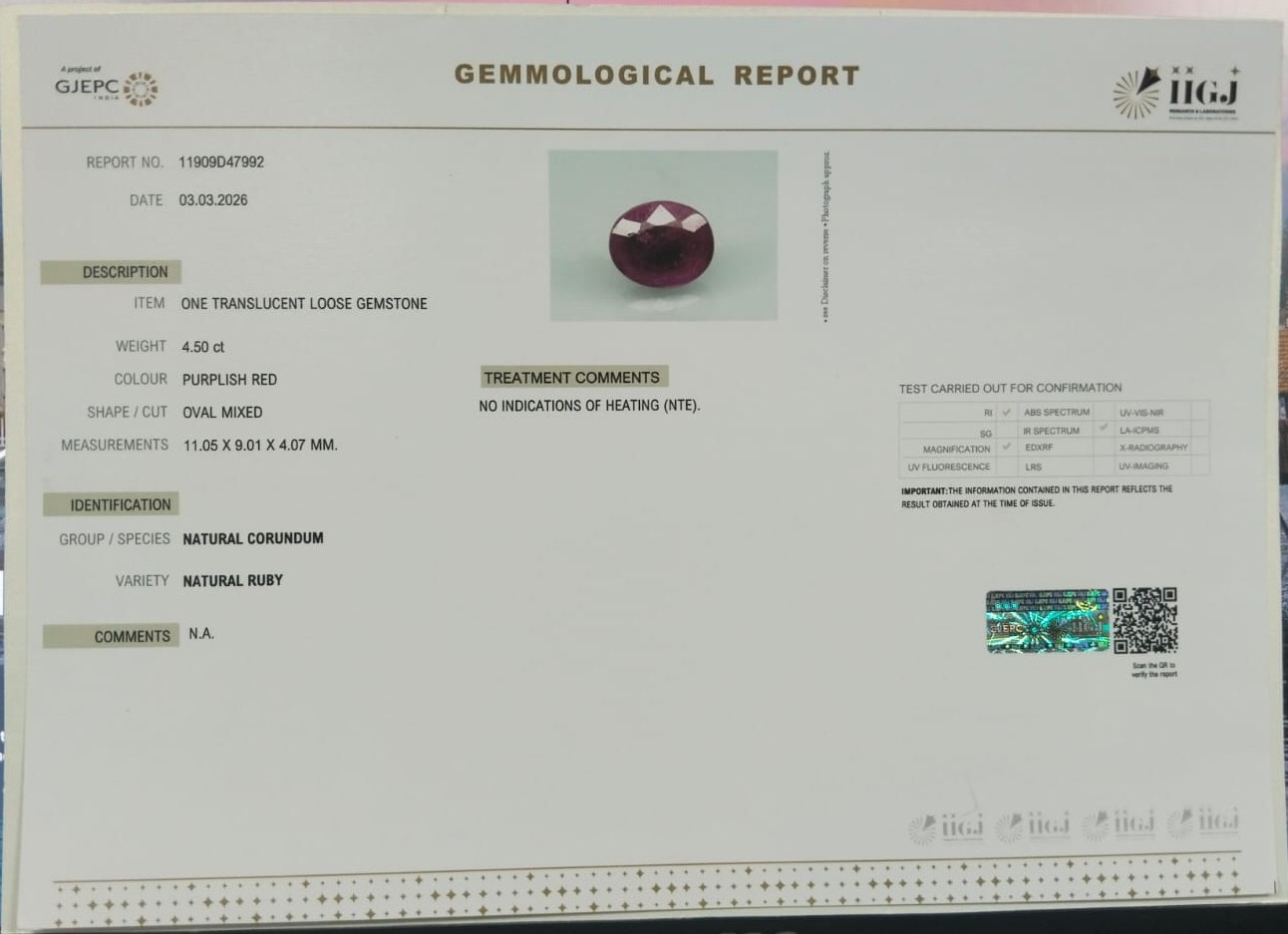 Beautiful 4.5 Cts Natural Ruby (AAA-Mines) sva 5+ Ratti RUBY. Free Horoscope & Free Pundit Ji Astrological Advise / Consultation. Original Natural Lab certified gems by IGI GTL / Birth stones / Large Gem Selection of shree shubh Rashi Ratan Vedic dhan at Gem Mines. May Bhagwan Brahma, Vishnu, Shiv & Universe bless you.