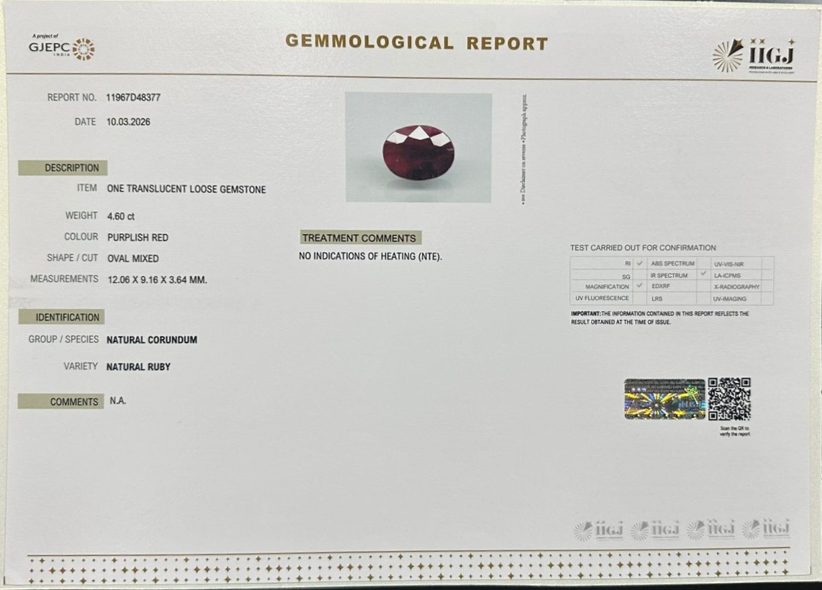 Beautiful 4.6 Cts Natural Ruby (AAA+-Mines) sva 5+ Ratti RUBY. Free Horoscope & Free Pundit Ji Astrological Advise / Consultation. Original Natural Lab certified gems by IGI GTL / Birth stones / Large Gem Selection of shree shubh Rashi Ratan Vedic dhan at Gem Mines. May Bhagwan Brahma, Vishnu, Shiv & Universe bless you.