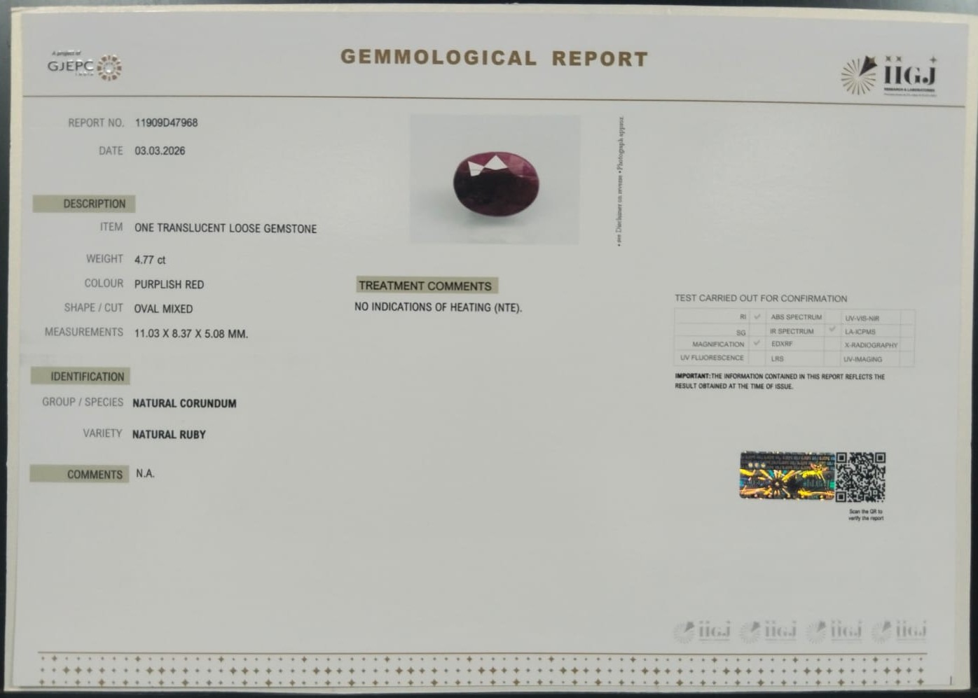 Beautiful 4.77 Cts Natural Ruby (AAA+-Mines) sva 5+ Ratti RUBY. Free Horoscope & Free Pundit Ji Astrological Advise / Consultation. Original Natural Lab certified gems by IGI GTL / Birth stones / Large Gem Selection of shree shubh Rashi Ratan Vedic dhan at Gem Mines. May Bhagwan Brahma, Vishnu, Shiv & Universe bless you.