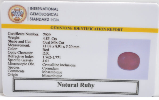 Beautiful 4.85 Cts Natural Ruby (AAA-Mines) sva 5+ Ratti RUBY. Free Horoscope & Free Pundit Ji Astrological Advise / Consultation. Original Natural Lab certified gems by IGI GTL / Birth stones / Large Gem Selection of shree shubh Rashi Ratan Vedic dhan at Gem Mines. May Bhagwan Brahma, Vishnu, Shiv & Universe bless you.