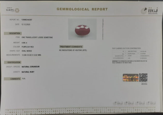 Beautiful 4.96 Cts Natural Ruby (Top-Mines) sva 5+ Ratti RUBY. Free Horoscope & Free Pundit Ji Astrological Advise / Consultation. Original Natural Lab certified gems by IGI GTL / Birth stones / Large Gem Selection of shree shubh Rashi Ratan Vedic dhan at Gem Mines. May Bhagwan Brahma, Vishnu, Shiv & Universe bless you.
