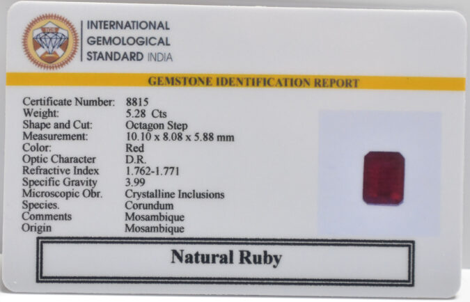 Beautiful 5.28 Cts Natural Ruby (AAA+-Mines) sva 5+ Ratti RUBY. Free Horoscope & Free Pundit Ji Astrological Advise / Consultation. Original Natural Lab certified gems by IGI GTL / Birth stones / Large Gem Selection of shree shubh Rashi Ratan Vedic dhan at Gem Mines. May Bhagwan Brahma, Vishnu, Shiv & Universe bless you.