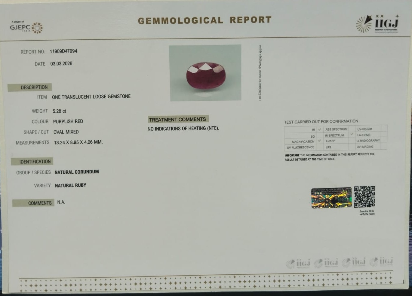 Beautiful 5.28 Cts Natural Ruby (AAA-Mines) sva 5+ Ratti RUBY. Free Horoscope & Free Pundit Ji Astrological Advise / Consultation. Original Natural Lab certified gems by IGI GTL / Birth stones / Large Gem Selection of shree shubh Rashi Ratan Vedic dhan at Gem Mines. May Bhagwan Brahma, Vishnu, Shiv & Universe bless you.