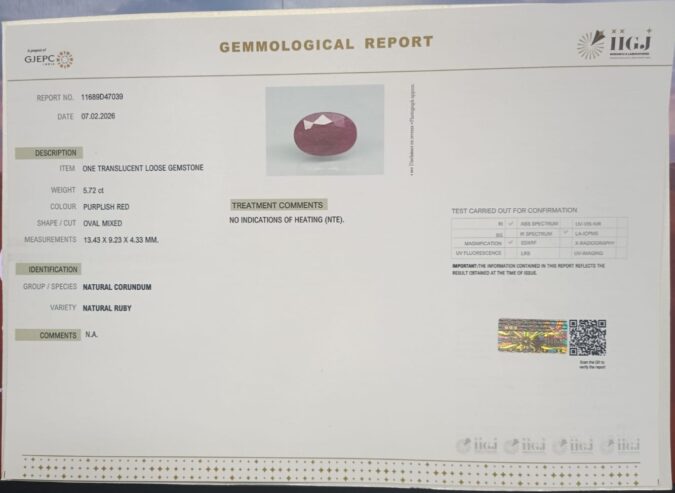 Beautiful 5.72 Cts Natural Ruby (Top-Mines) sva 6+ Ratti RUBY. Free Horoscope & Free Pundit Ji Astrological Advise / Consultation. Original Natural Lab certified gems by IGI GTL / Birth stones / Large Gem Selection of shree shubh Rashi Ratan Vedic dhan at Gem Mines. May Bhagwan Brahma, Vishnu, Shiv & Universe bless you.