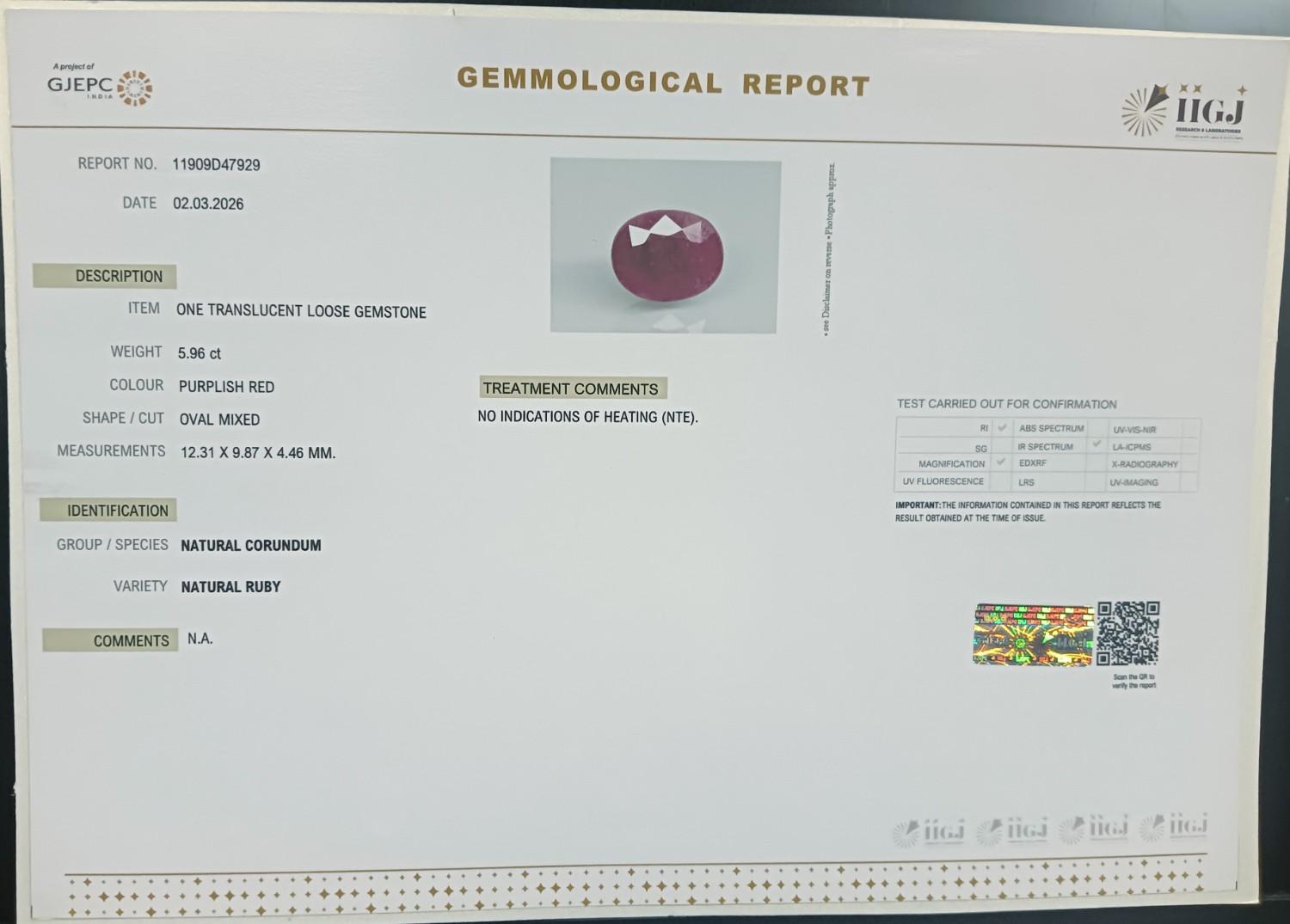 Beautiful 5.96 Cts Natural Ruby (AAA-Mines) sva 6+ Ratti RUBY. Free Horoscope & Free Pundit Ji Astrological Advise / Consultation. Original Natural Lab certified gems by IGI GTL / Birth stones / Large Gem Selection of shree shubh Rashi Ratan Vedic dhan at Gem Mines. May Bhagwan Brahma, Vishnu, Shiv & Universe bless you.