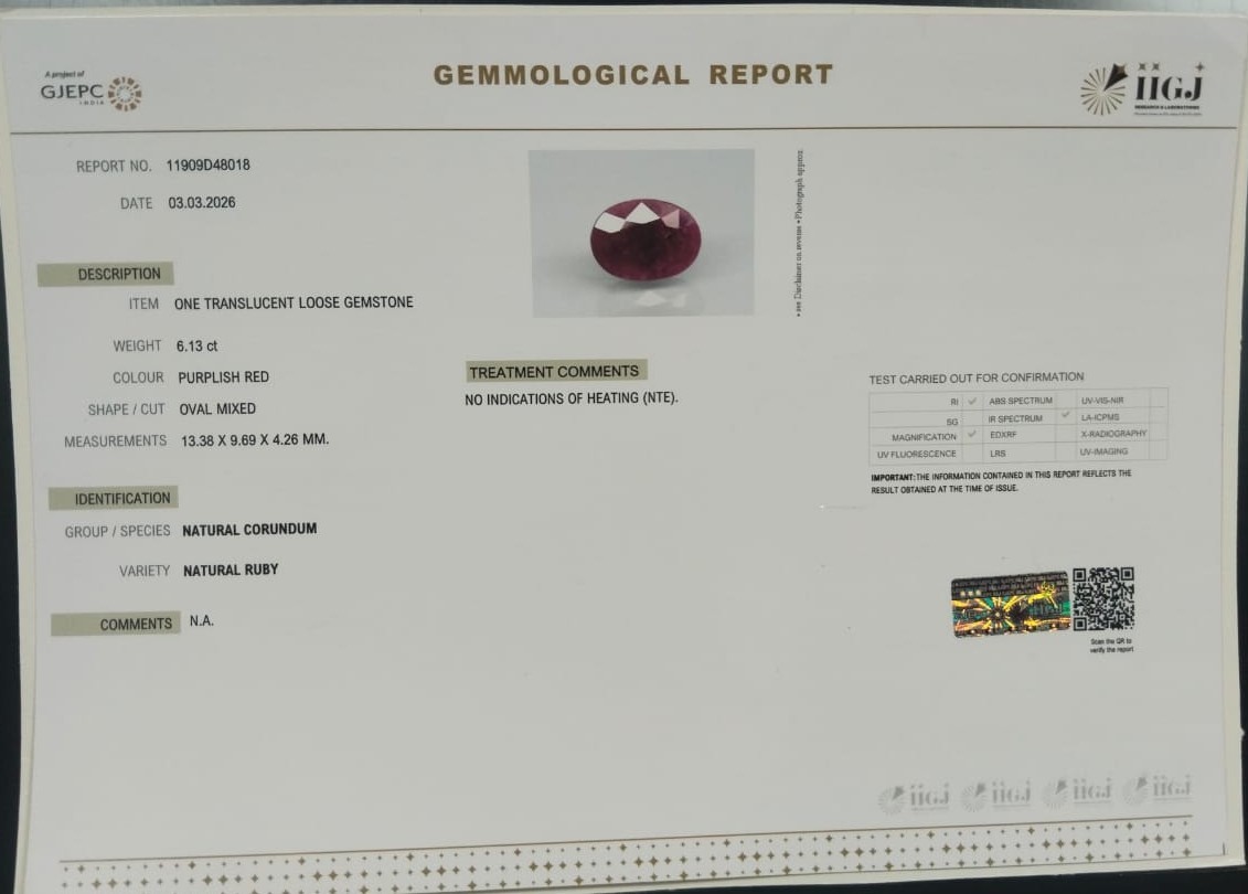 Beautiful 6.13 Cts Natural Ruby (AAA-Mines) sva 6+ Ratti RUBY. Free Horoscope & Free Pundit Ji Astrological Advise / Consultation. Original Natural Lab certified gems by IGI GTL / Birth stones / Large Gem Selection of shree shubh Rashi Ratan Vedic dhan at Gem Mines. May Bhagwan Brahma, Vishnu, Shiv & Universe bless you.