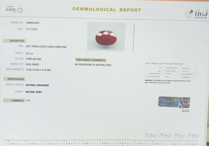 Beautiful 6.81 Cts Natural Ruby (Top-Mines) sva 7+ Ratti RUBY. Free Horoscope & Free Pundit Ji Astrological Advise / Consultation. Original Natural Lab certified gems by IGI GTL / Birth stones / Large Gem Selection of shree shubh Rashi Ratan Vedic dhan at Gem Mines. May Bhagwan Brahma, Vishnu, Shiv & Universe bless you.