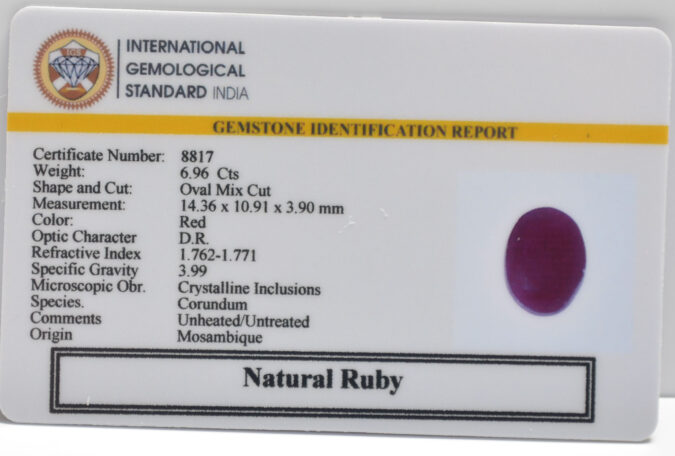 Beautiful 6.96 Cts Natural Ruby (AAA-Mines) sva 7+ Ratti RUBY. Free Horoscope & Free Pundit Ji Astrological Advise / Consultation. Original Natural Lab certified gems by IGI GTL / Birth stones / Large Gem Selection of shree shubh Rashi Ratan Vedic dhan at Gem Mines. May Bhagwan Brahma, Vishnu, Shiv & Universe bless you.