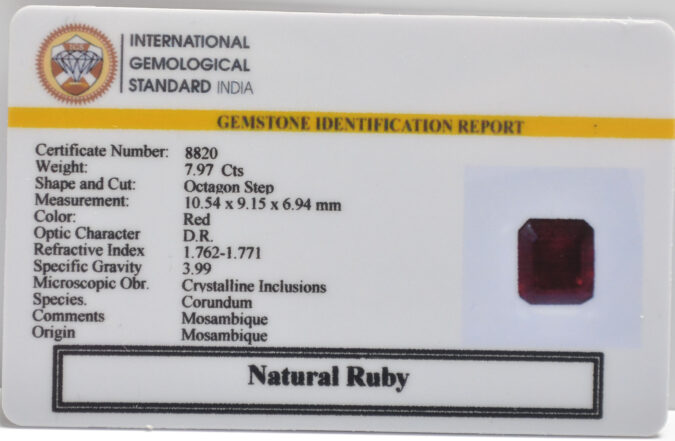 Beautiful 7.97 Cts Natural Ruby (AAA+-Mines) sva 8+ Ratti RUBY. Free Horoscope & Free Pundit Ji Astrological Advise / Consultation. Original Natural Lab certified gems by IGI GTL / Birth stones / Large Gem Selection of shree shubh Rashi Ratan Vedic dhan at Gem Mines. May Bhagwan Brahma, Vishnu, Shiv & Universe bless you.