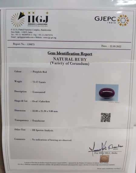 Beautiful 72.57 Ct. Natural Ruby (AAA+-Mines) sva 80+ Ratti Manik. Free Horoscope & Free Pundit Ji Astrological Advise / Consultation. Original Natural Lab certified gems by IGI GTL / Birth stones / Large Gem Selection of shree shubh Rashi Ratan Vedic dhan at Gem Mines. May Bhagwan Brahma, Vishnu, Shiv & Universe bless you.