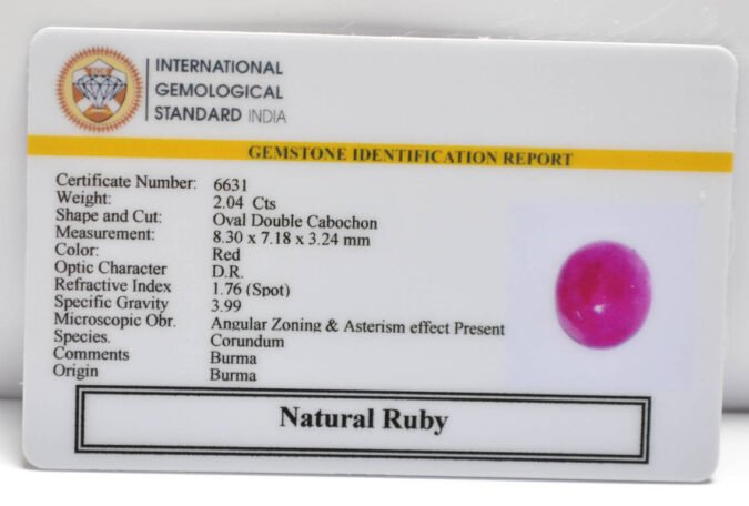 Beautiful 2.04 Cts Natural Ruby (AAA+-Mines) sva 2+ Ratti RUBY (BURMA MINES). Free Horoscope & Free Pundit Ji Astrological Advise / Consultation. Original Natural Lab certified gems by IGI GTL / Birth stones / Large Gem Selection of shree shubh Rashi Ratan Vedic dhan at Gem Mines. May Bhagwan Brahma, Vishnu, Shiv & Universe bless you.